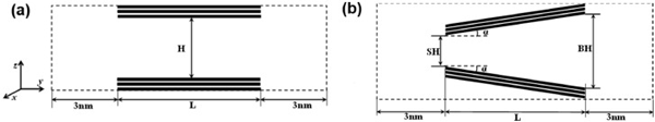 狹縫孔由半有限狹縫孔由兩個平行的石墨壁組成。每個壁包含三個石墨烯層,如圖1(a)所示?虻奶摼表示模擬框在y和z方向上的邊界。周期性邊界條件僅適用于x方向。兩個開口端與大塊氣藏相連,每個氣藏沿y軸的長度為3nm,孔隙寬度決定了z方向的尺寸。因此,通過孔內分子與體相的相互作用,可以在孔和周圍環境之間保持機械平衡?讖紿是指通過一個壁最內層中碳原子中心的平面與相對壁的相應平面之間的距離。楔形孔在圖1(b)描繪了一個開放的楔形孔及其結構參數:小端(SH)和大端(BH)的孔徑,軸向孔長(L)和半角(α)?虻奶摼表示模擬框在y和z方向上的邊界。與狹縫孔一樣,開口端周圍的氣體沿y軸的長度為3nm,大端的寬度決定了z方向的尺寸。沿軸向(即,y方向)的孔長度是有限的L,而在x方向上的尺寸在應用周期性邊界條件的情況下假定為無限。