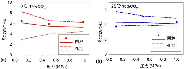 圖4:在T =(a)0℃和(b)25℃時,在大約20%的二氧化碳在活性炭孔隙呢,CO2對CH4的選擇性與實驗數據。