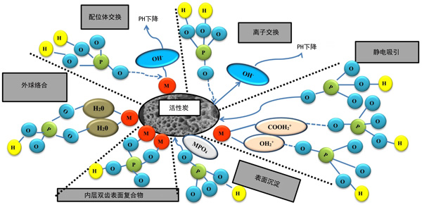 圖2:磷吸附到活性炭表面的潛在機(jī)理。
